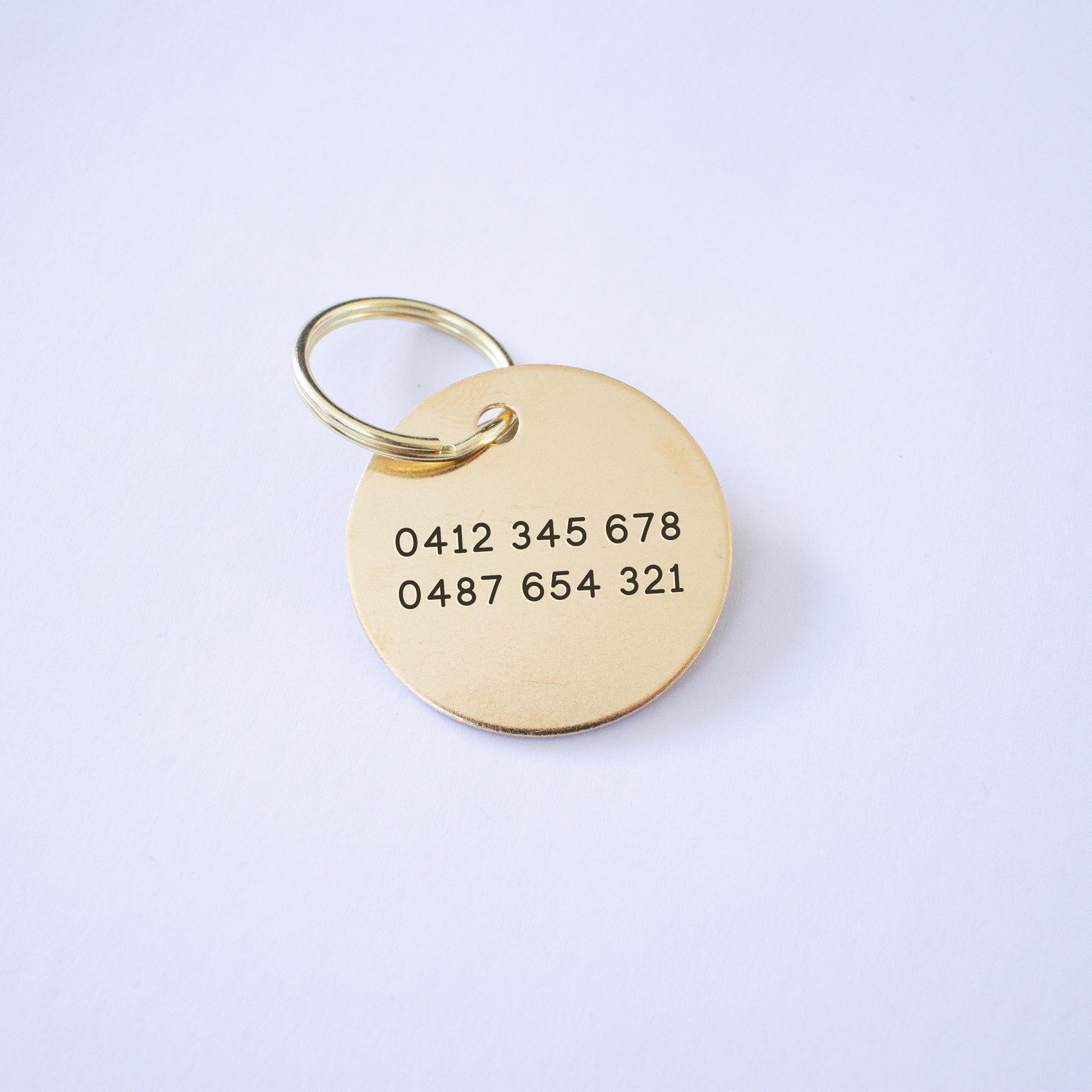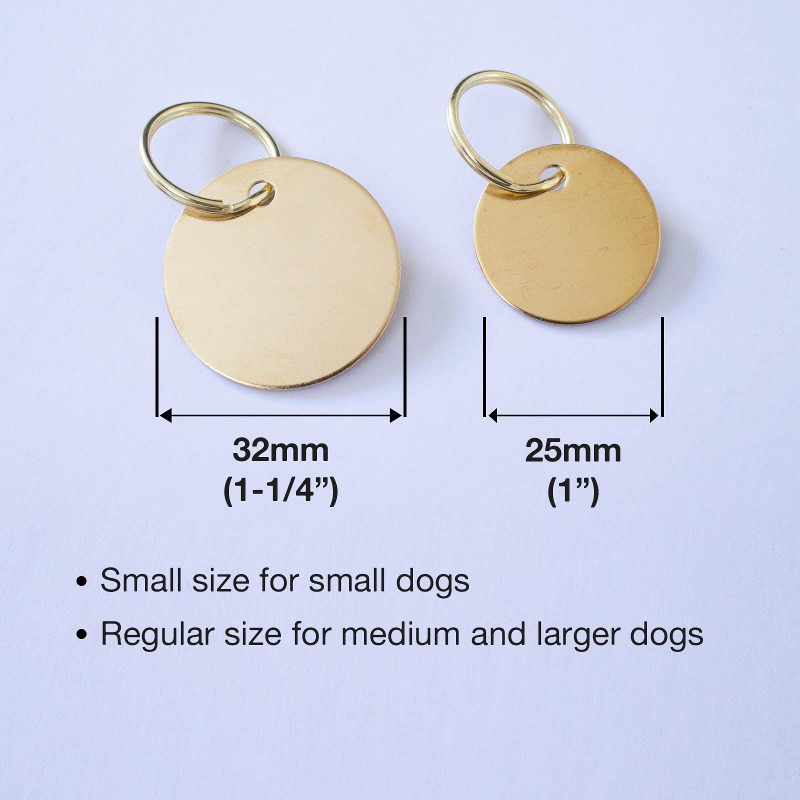 Etched Natural Brass Dog Tag - Made and designed by me in Australia This simple style ID tag can be customised with your dog or cats name and phone number, and any additional information you would like.