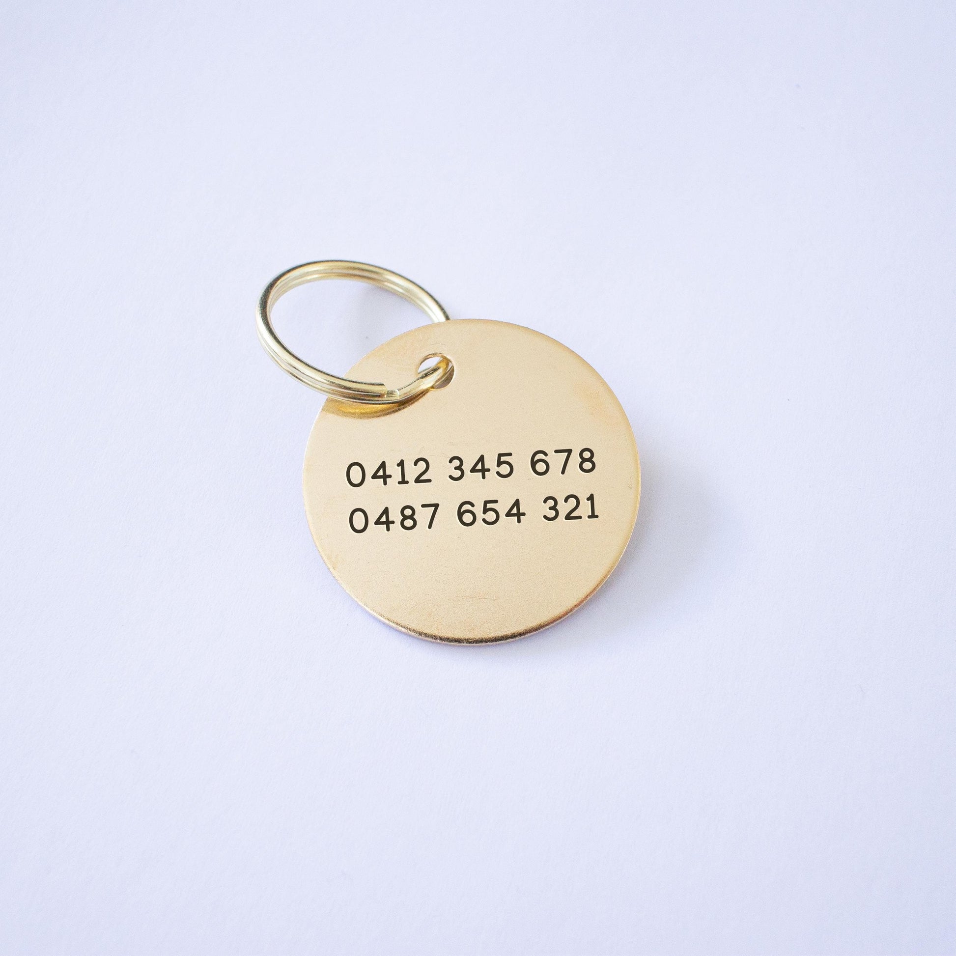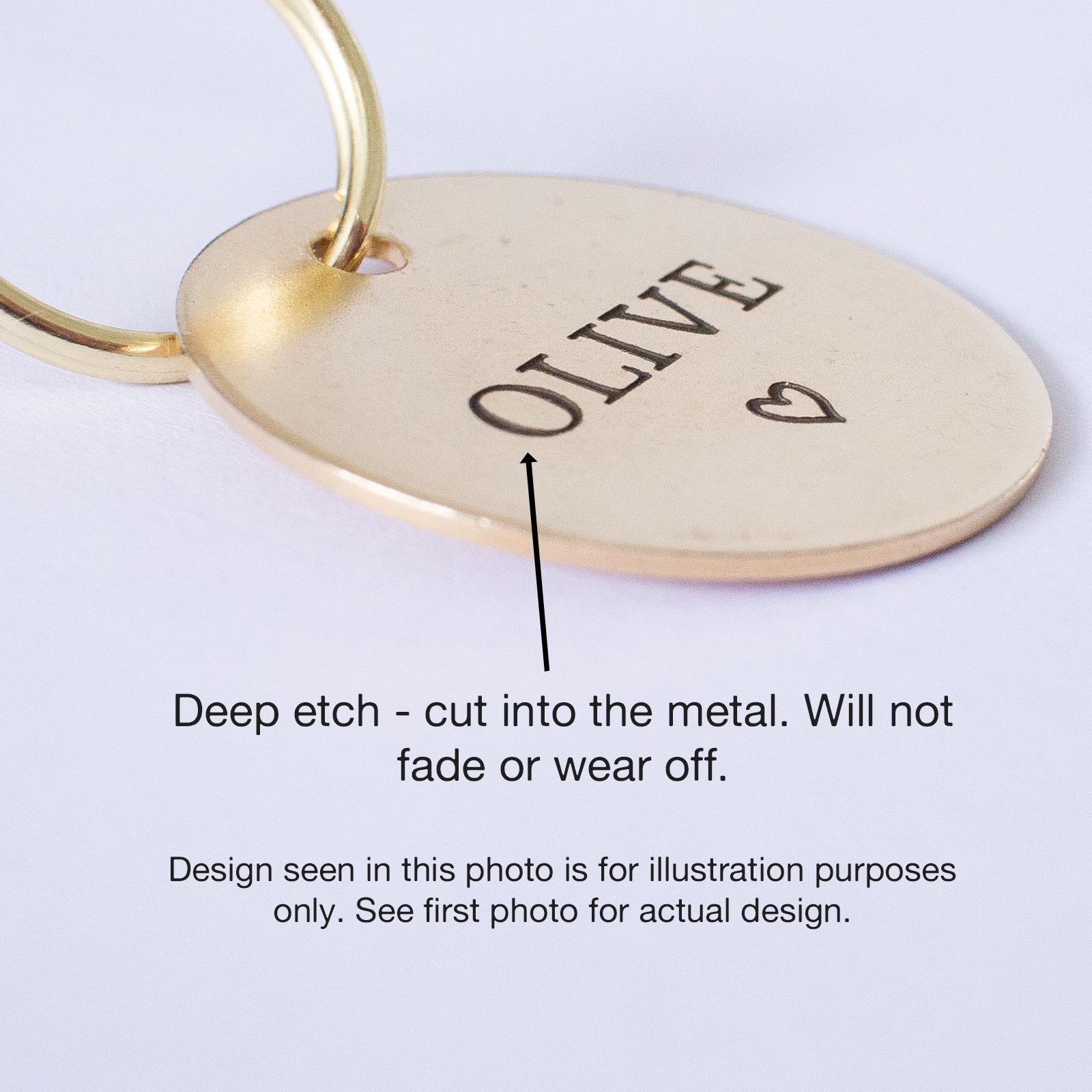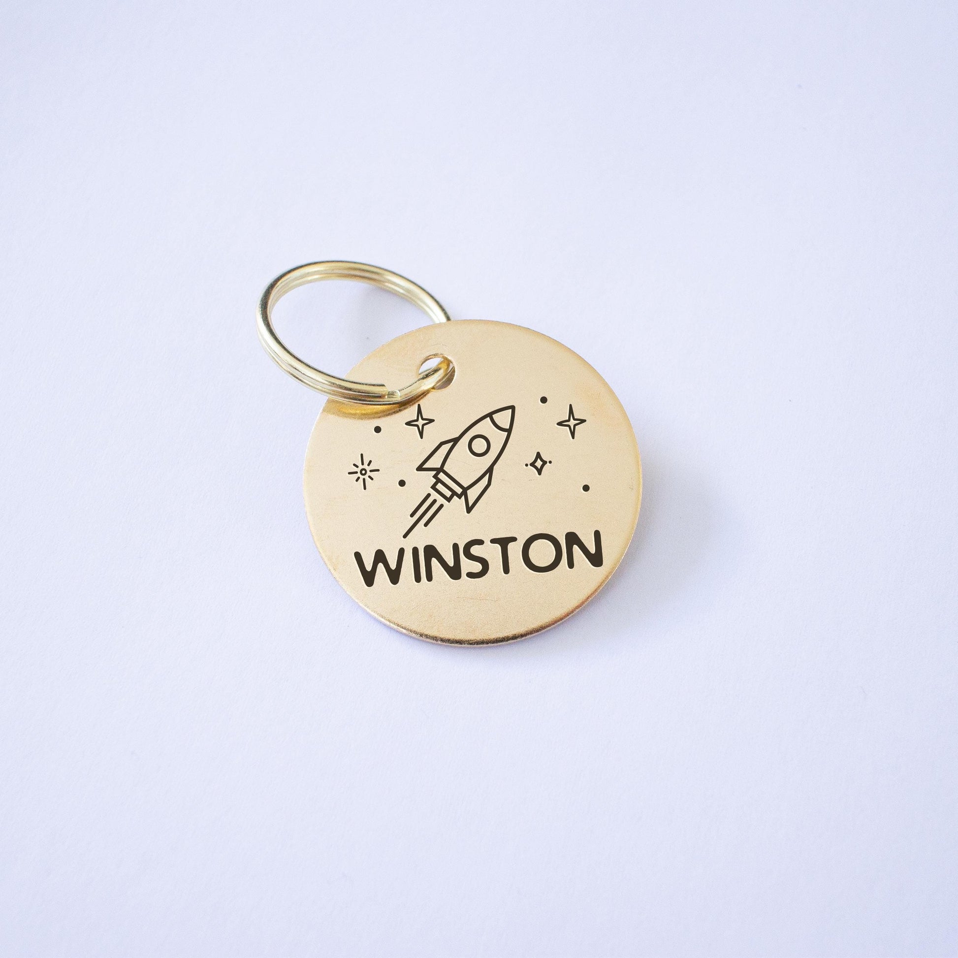 Etched Natural Brass Rocket Dog Tag - Made and designed by me in Australia This simple style ID tag can be customised with your dog or cats name and phone number, and any additional information you would like.