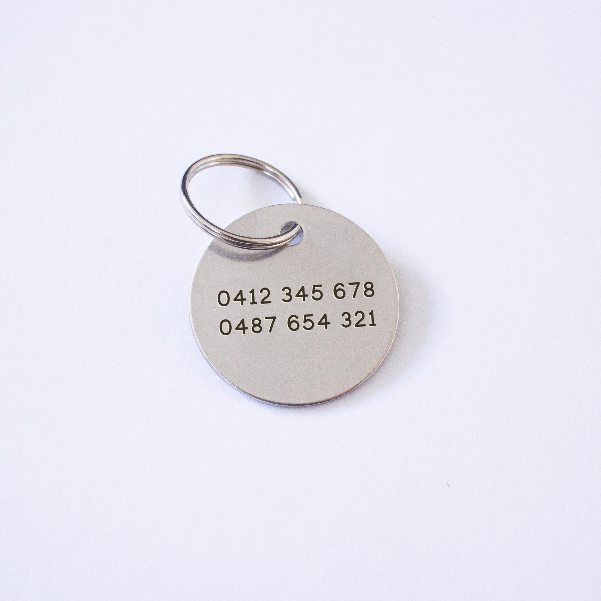 This simple style ID tag can be customised with your dog or cats name and phone number, and any additional information you would like.
