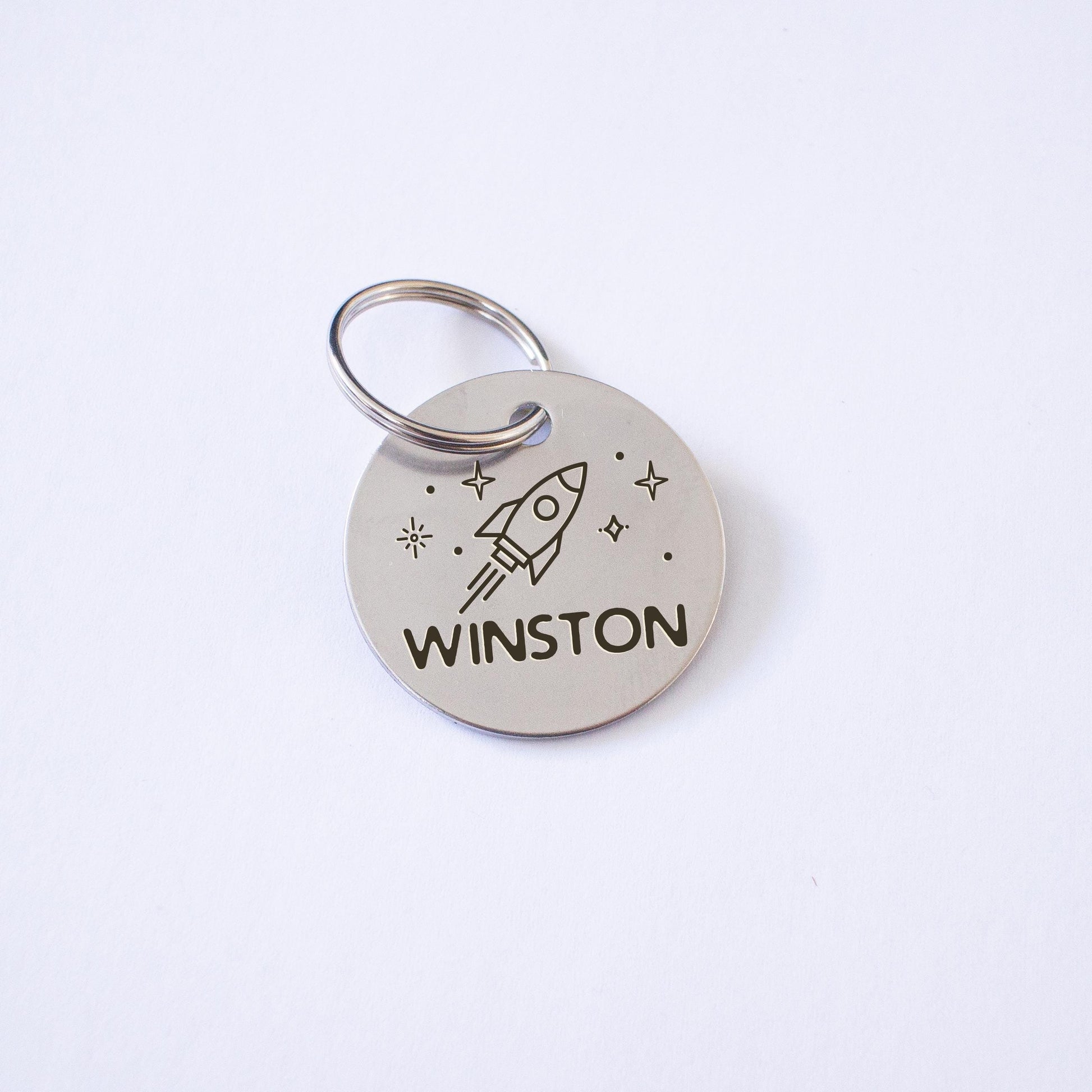 Etched Silver Rocket design Dog Tag - Made and designed by me in Australia This simple style ID tag can be customised with your dog or cats name and phone number, and any additional information you would like.