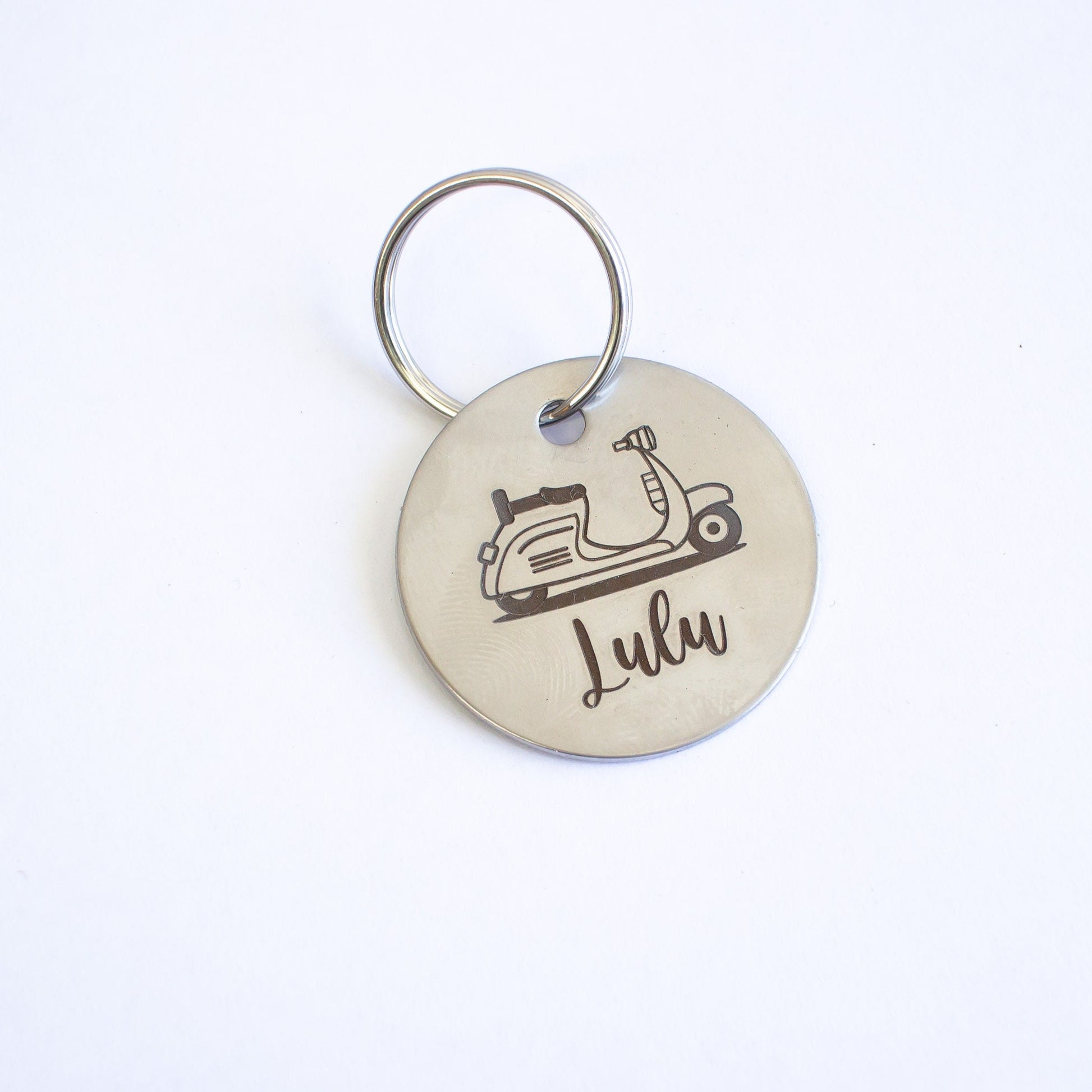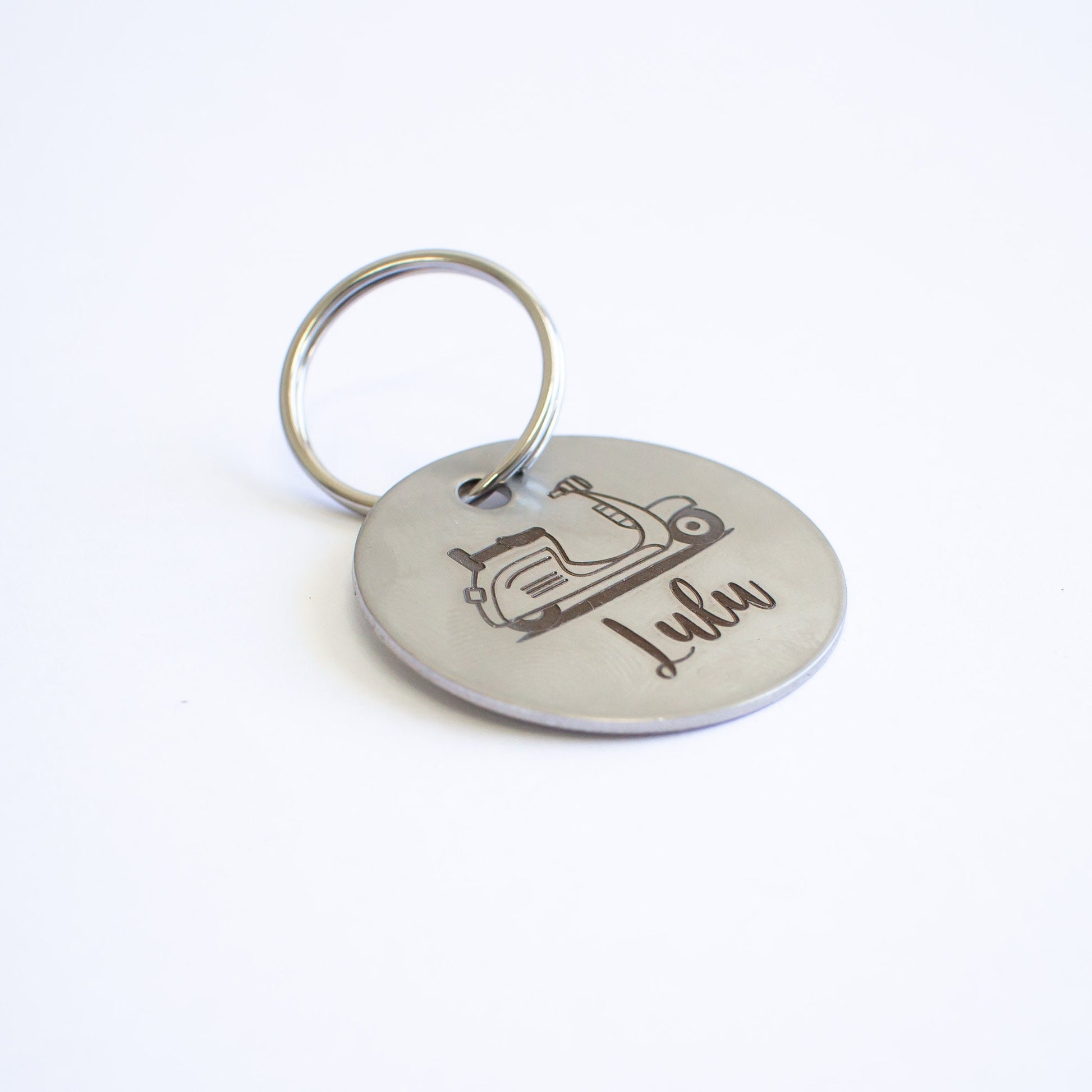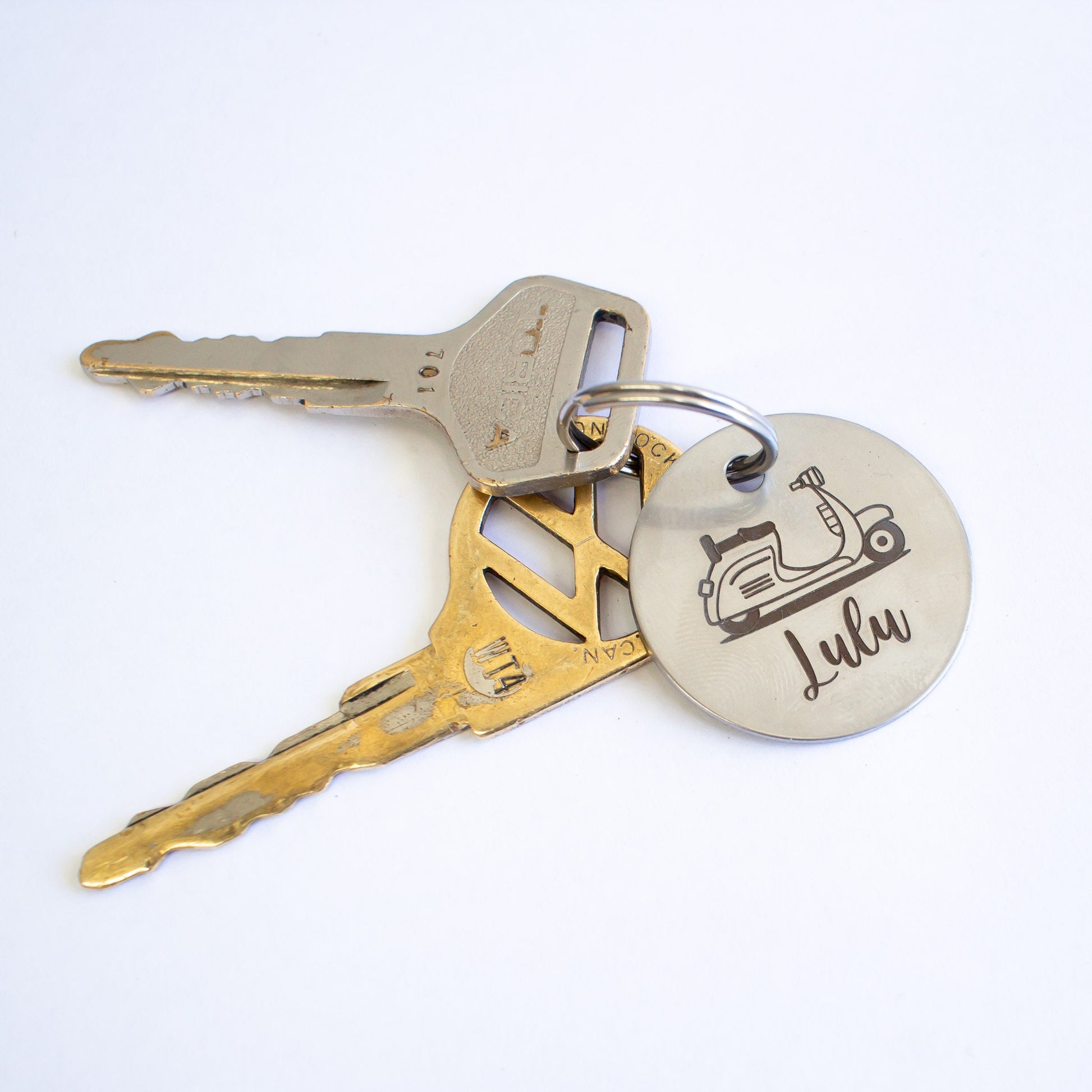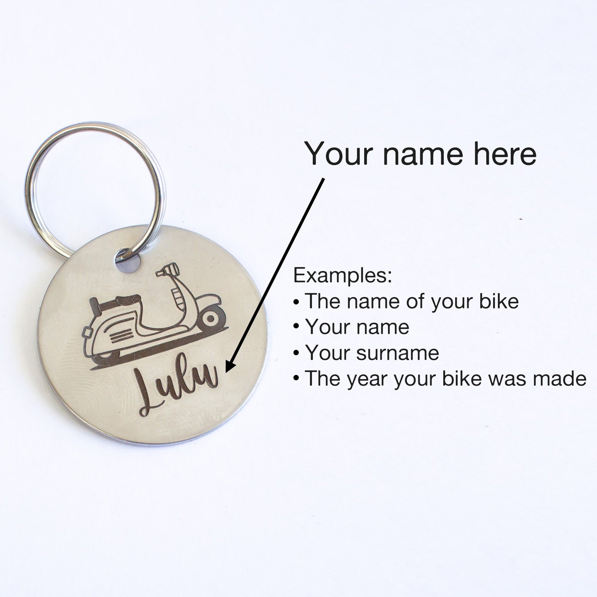 This vintage Vespa key tag can be customised with your Vespa's name, or your name. Why stop there? Put whatever you want on it! Some ideas are - The Vespa's year, "Bobs Vespa", or perhaps a phone number in case they get lost.