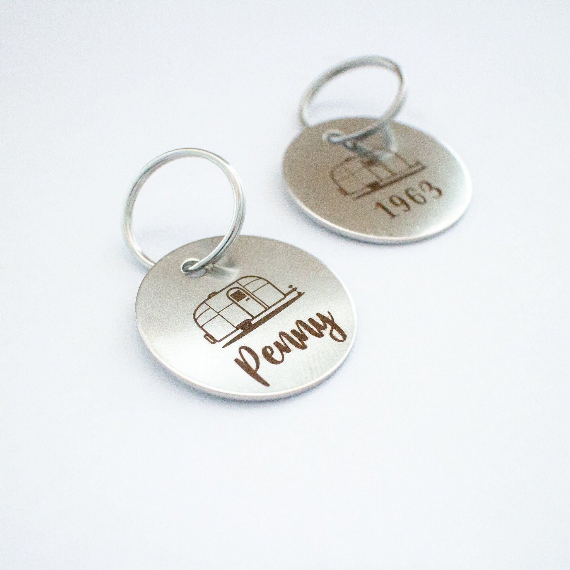 This design is based on a vintage Airstream caravan trailer. This vintage style key tag can be customised with the name of your airstream or your name. Why stop there? Put whatever name you want on it!