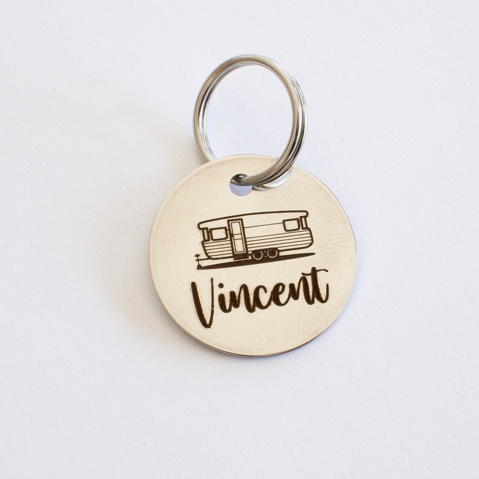 This design is based on a vintage Viscount dual axel caravan with corner windows. This vintage style key tag can be customised with your caravan or trailers name, or your name. Why stop there? Put whatever name you want on it!