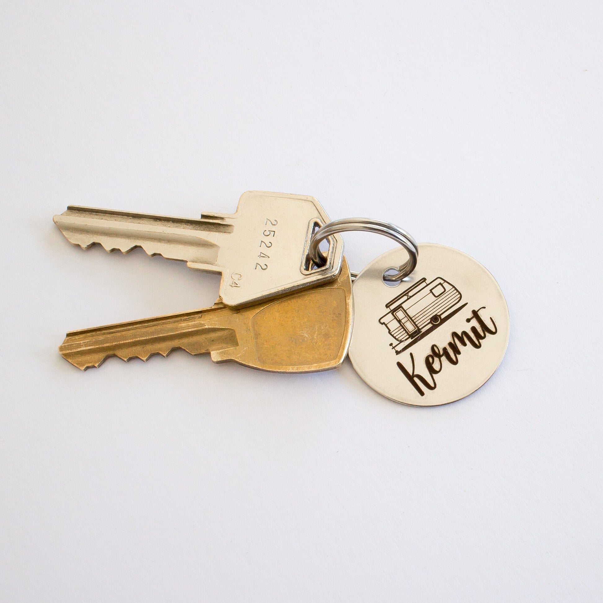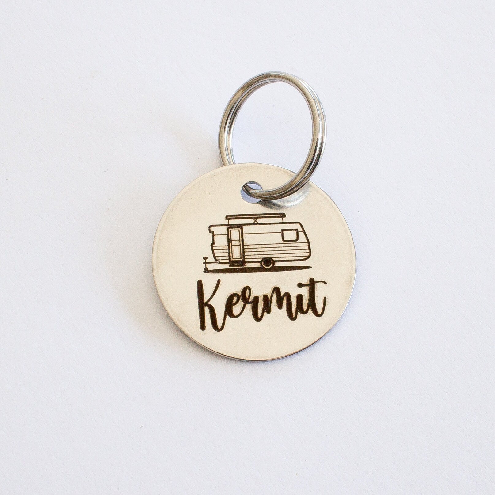 This design is based on a vintage Viscount pop top caravan. This vintage style key tag can be customised with your caravan or trailers name, or your name. Why stop there? Put whatever name you want on it!